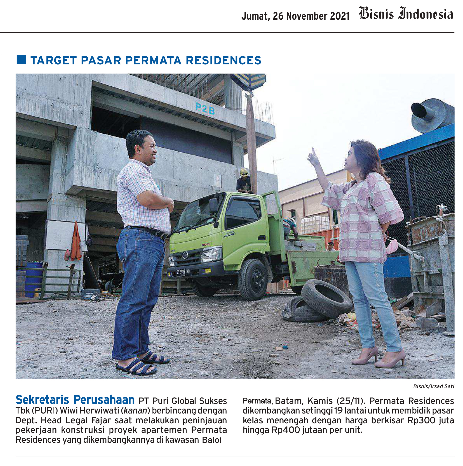 Sekretasi Perusahaan PT Puri Global Sukses TBK (PURI) Wiwi Heriwati (kanan) berbincang dengan Dept. Head Legal Fajar saat melakukan peninjauan pekerjaan konstruksi proyek apartemen Permata Residences yang dikembangkannya di kawasan Permata Regency, Baloi, Batam, Kamis (25/11). Permata Residences dikembangkan setinggi 19 lantai untuk membidik pasar kelas menengah dengan harga berkisar Rp300 juta hingga Rp400 per unit.