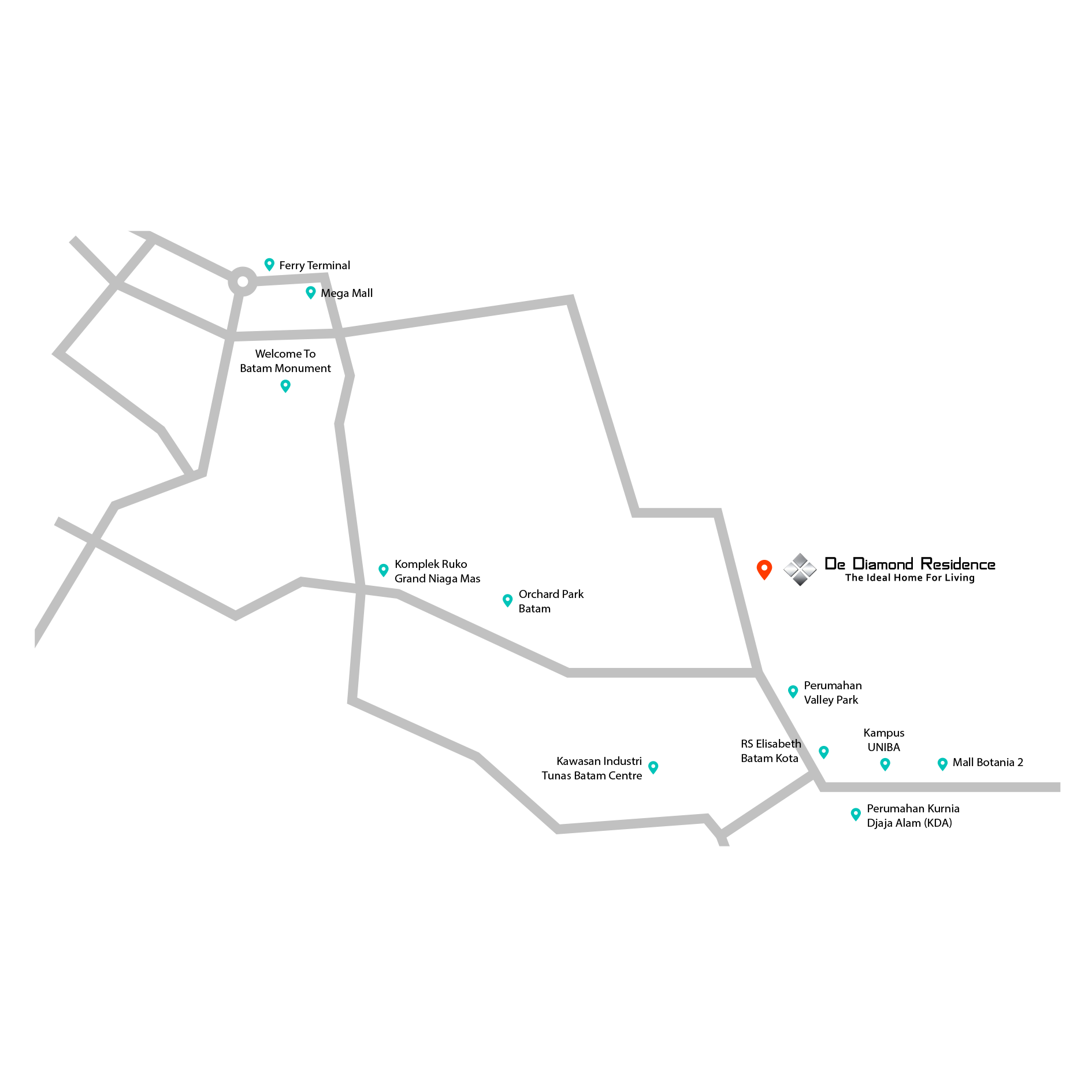 Perumahan De Diamond Residence terletak di lokasi yang sangat strategis, dekat dengan Rumah Sakit Elizabeth, Kampus UNIBA, Terminal Feri Internasional, Mega Mall dan Botania 2 Mall